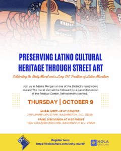 Join Hola Cultura and the DC Preservation League on Thursday, Oct. 9, at 6 p.m., for a community celebration of the Unity Mural and all of D.C.’s amazing Latine murals and their beautiful stories of community perseverance and resilience.